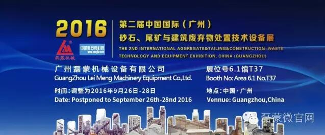 而中國(guó)砂石裝備展是專(zhuān)門(mén)針對(duì)砂石骨料破碎的一個(gè)專(zhuān)業(yè)展會(huì),通過(guò)該展會(huì)我們會(huì)提供最新的設(shè)備、優(yōu)質(zhì)的服務(wù)。2016年9月26日-28日,廣州市磊蒙機(jī)械設(shè)備有限公司與您相約廣交會(huì)琶洲展館,相約第二屆中國(guó)國(guó)際砂石裝備展!不見(jiàn)不散!