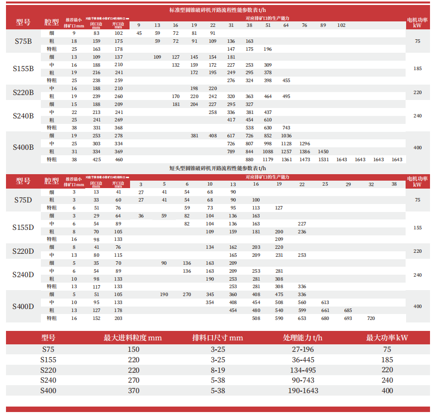 標(biāo)準(zhǔn)型圓錐破碎機(jī)開路流程性能參數(shù)表t/h